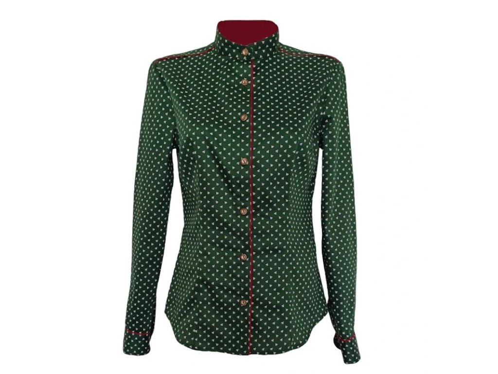 Střih elegantní dámské košile je vypasovaný se spodní obrubou do oblouku. Límec je takzvaný stojáček. Halenka má prsní záševky a díky tomu daleko lépe sedí.