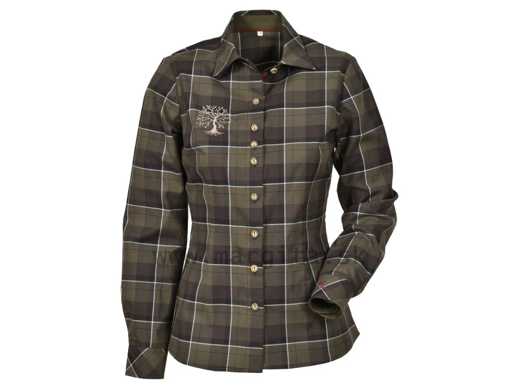 Dámská myslivecká károvaná košile Margita Ester s dlouhým rukávem. Je vyrobena z příjemné elastické bavlny. Košile je zelenohnědé barvy, knoflíčky jsou vyrobeny z imitace paroží a je doplněna krásnou výšivkou stromu na přední části košile. Precizní šití. Slušivý vypasovaný tvar.