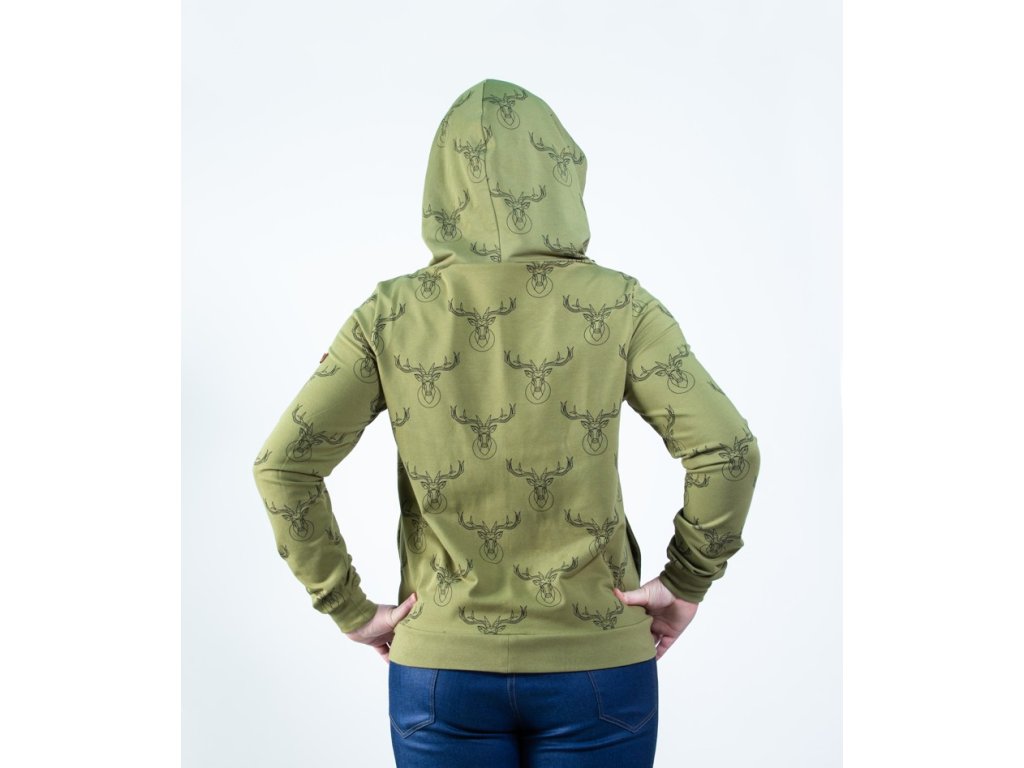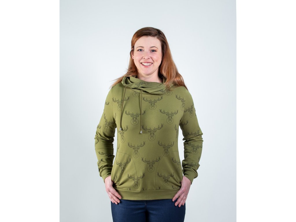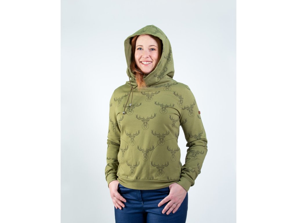 Pečlivě šitá a slušivě střižená dámská mikina s potiskem. V bočních švech má dvě kapsy. Velká kapuce je křížená asymetricky ke straně. Rukávy a spodní lem jsou lemovány pružným úpletem.