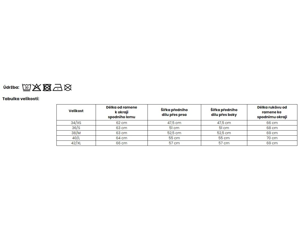 | Velikost | Délka od ramene k okraji spodního lemu | Šířka předního dílu přes prsa | Šířka předního dílu přes boky | Délka rukávu od ramene ke spodnímu okraji |