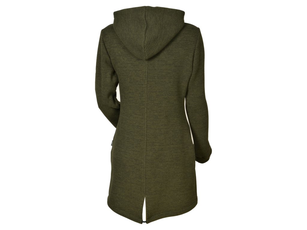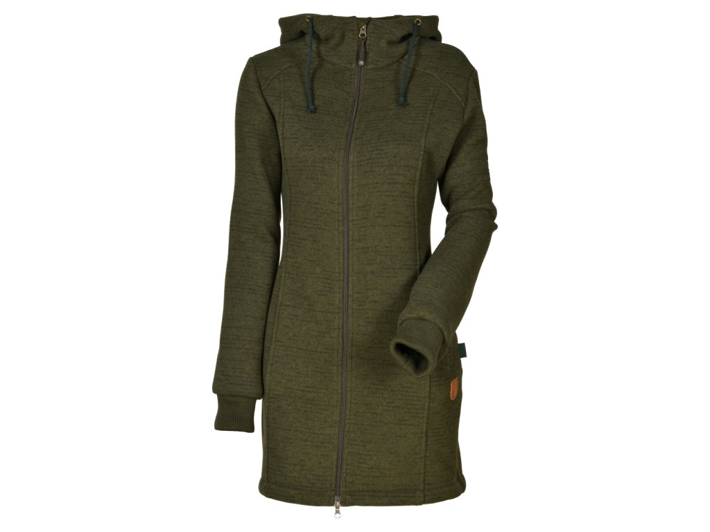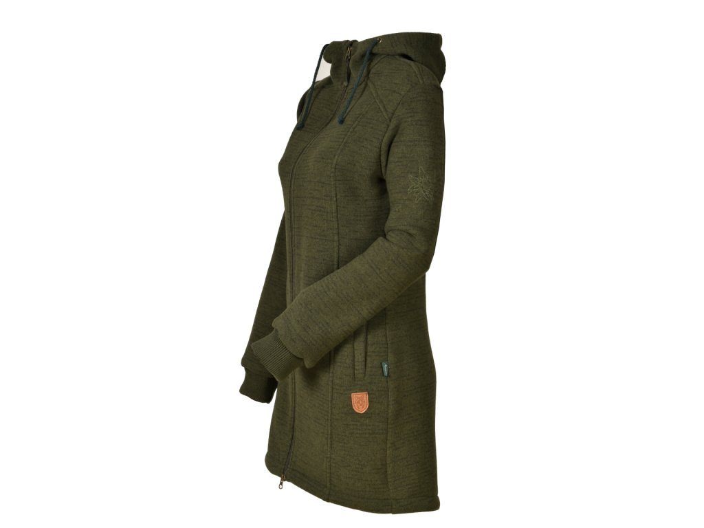 Dlouhá dámská myslivecká mikina Margita Michaela zelené barvy s kapucí je vyrobena z vysoce kvalitního materiálu Polartec Thermal Pro. Materiál je nízké hmotnosti a vysoké hřejivosti a odolnosti. Je upraven proti žmolkovatění a lze ho prát v pračce. Na mikině je výšivka plesnivce, použity jsou nejkvalitnější zipy YKK, má ženskému tělu slušivý zúžený střih a spodní část lze stáhnout.