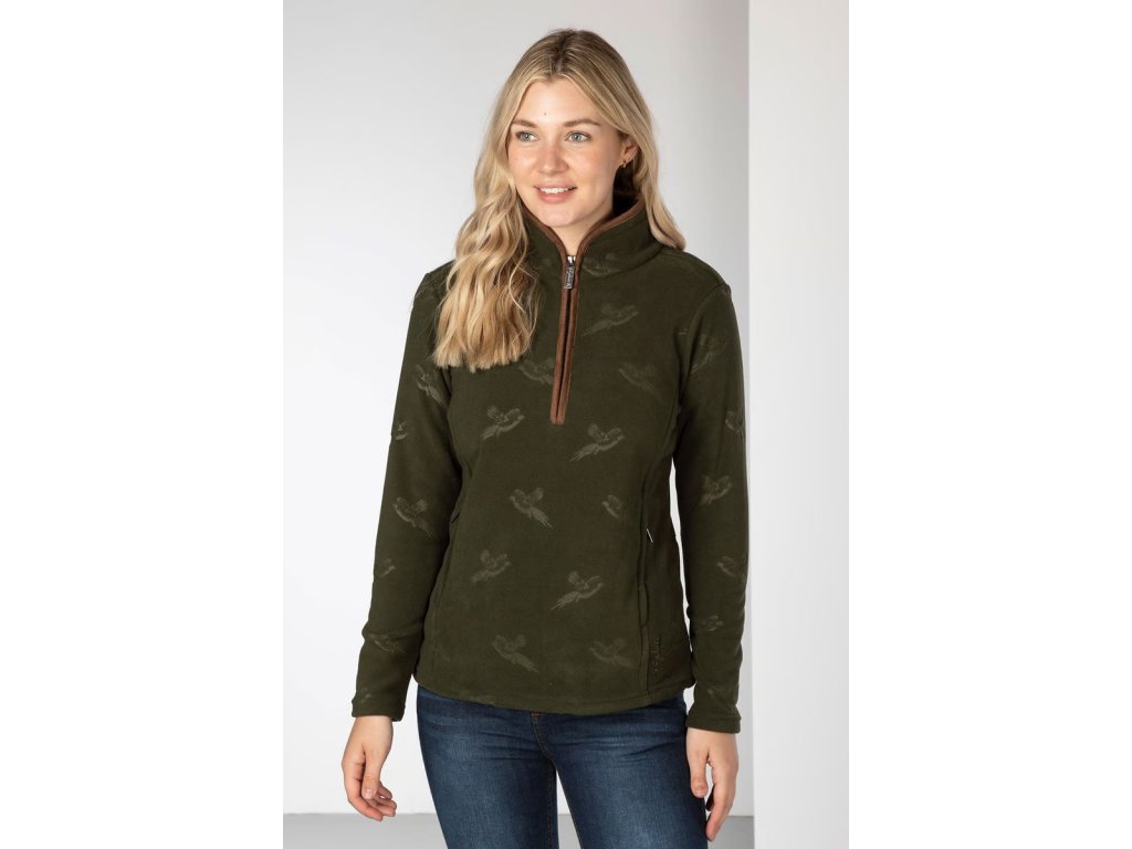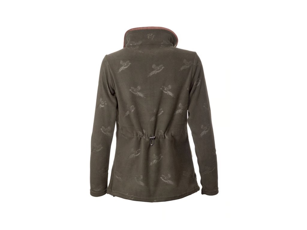 Krásná dámská myslivecká mikina z příjemného fleecového materiálu, který je zdobený siluetami bažantů v letu. To dělá mikinu opravdu výjimečnou, originální a velmi slušivou. Mikina má stojáček a dvě kapsy na zip, které jsou lemovány příjemným moleskin materiálem hnědé barvy. Mikinu lze vypasovat v oblasti beder a pasu a vytvarovat ji tak perfektně podle každé postavy.