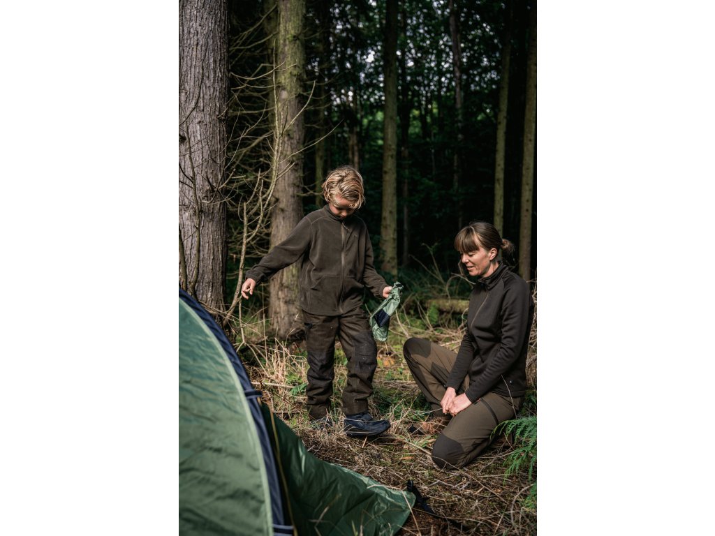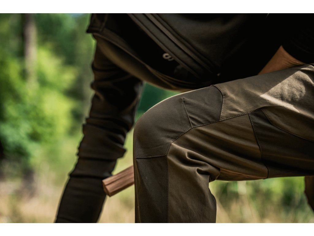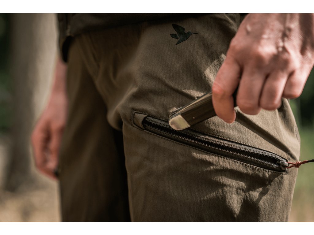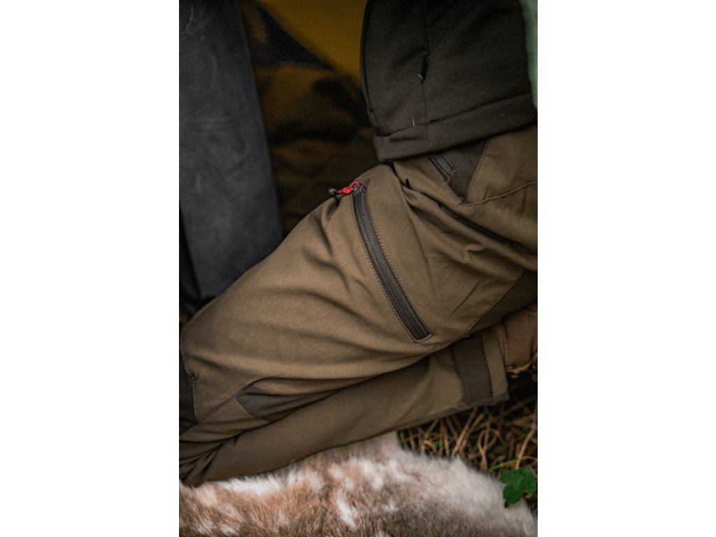Kalhoty mají elastický pas pro pohodlné nošení a tvarovaná kolena, která umožňují volný pohyb při chůzi, dřepu i při brodění terénem. Praktické kapsy na přední straně a na stehnech s bezpečným zapínáním na zip poskytují dostatek prostoru pro drobnosti, jako jsou telefon, klíče nebo lovecké doplňky. Spodní lem je nastavitelný, takže kalhoty snadno přizpůsobíte obuvi nebo počasí.