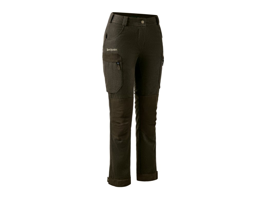 Dámské myslivecké kalhoty Deerhunter Lady Tatra z vlněného lodenového materiálu tmavě zelené barvy s vodě odpudivou úpravou. S tímto materiálem jsou v myslivosti nejlepší zkušenosti pro svou tepelnou izolaci kombinovanou s tichostí nutnou pro úspěšný lov. Kalhoty jsou kombinované s hnědým materiálem v imitaci kůže.