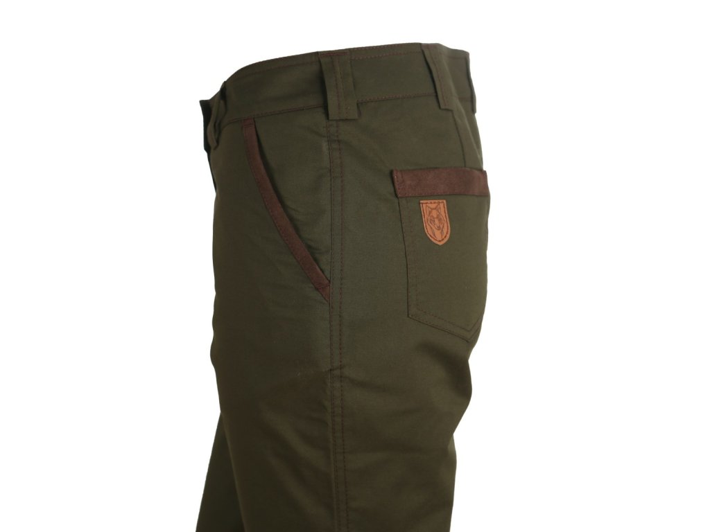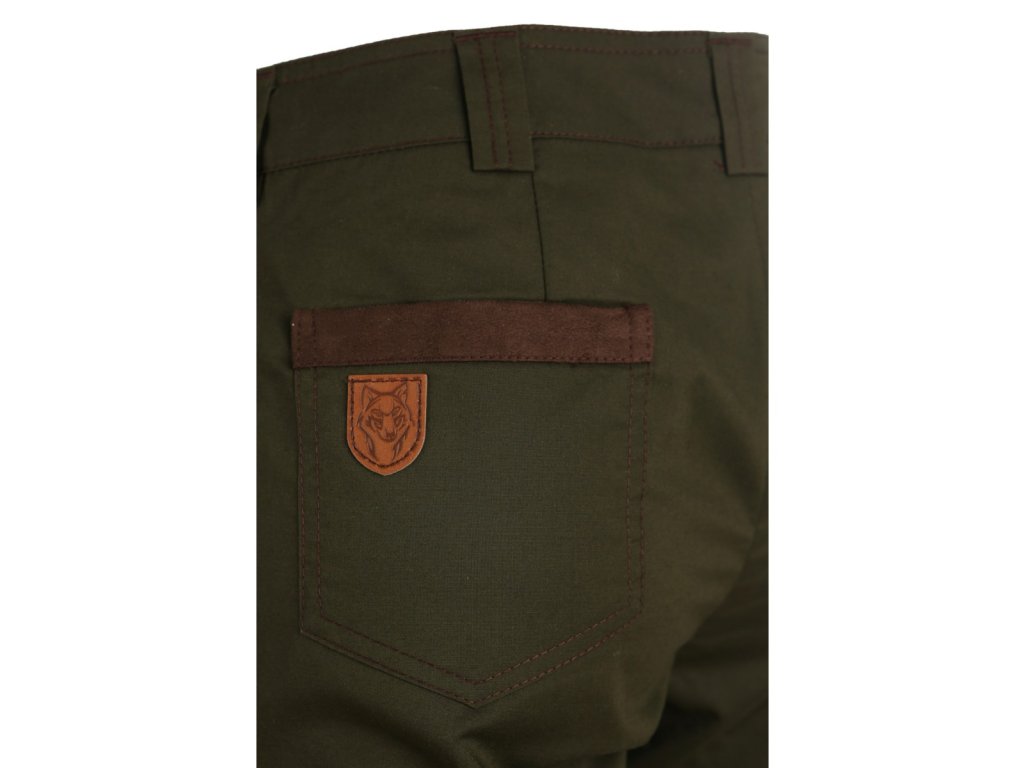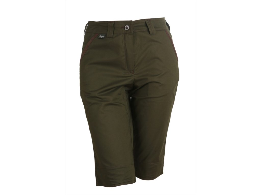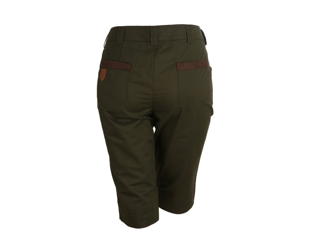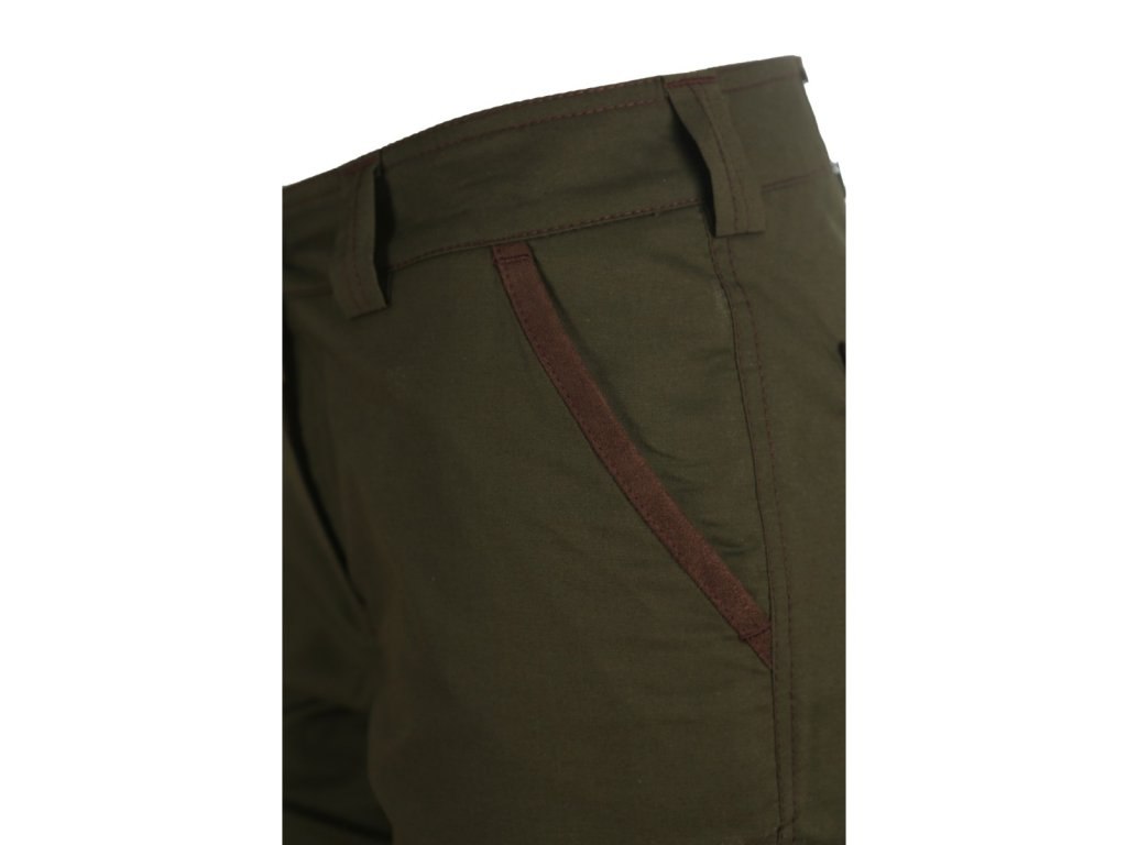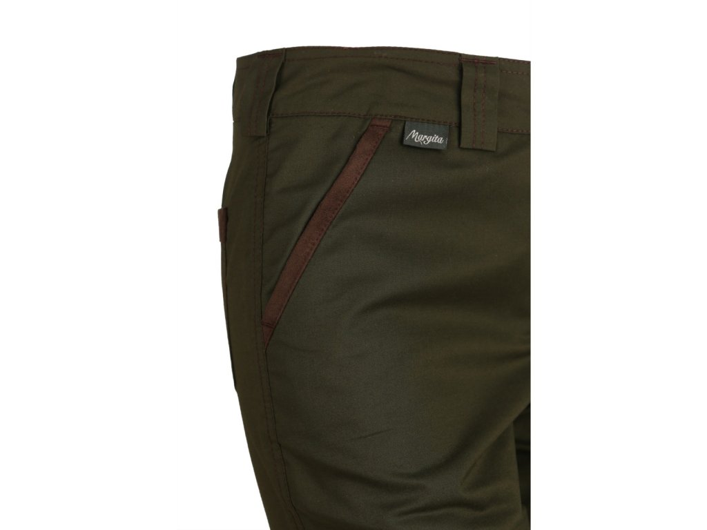 Pečlivě ušité dámské myslivecké kraťasy Margita Galina zelené barvy s hnědými doplňky v imitaci kůže. Kalhoty mají poutka na opasek, dvě přední a dvě zadní kapsy.