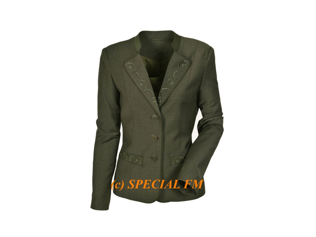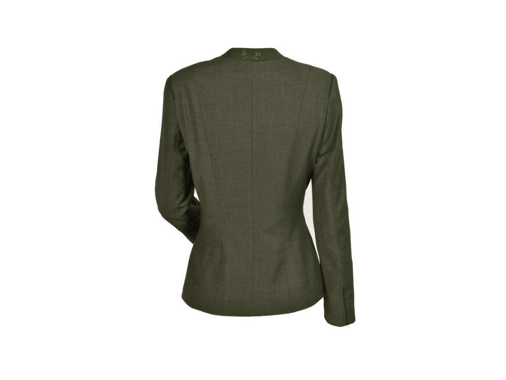 Dámské myslivecké precizně šité elegantní sako z lehkého a elastického materiálu. Sako má výšivky na kapsách a klopě. Rukávy jsou také zdobeny elegantní výšivkou. Sako se zapíná na tři ozdobné knoflíky. K saku je možno dokoupit sukni a společenskou vestu.