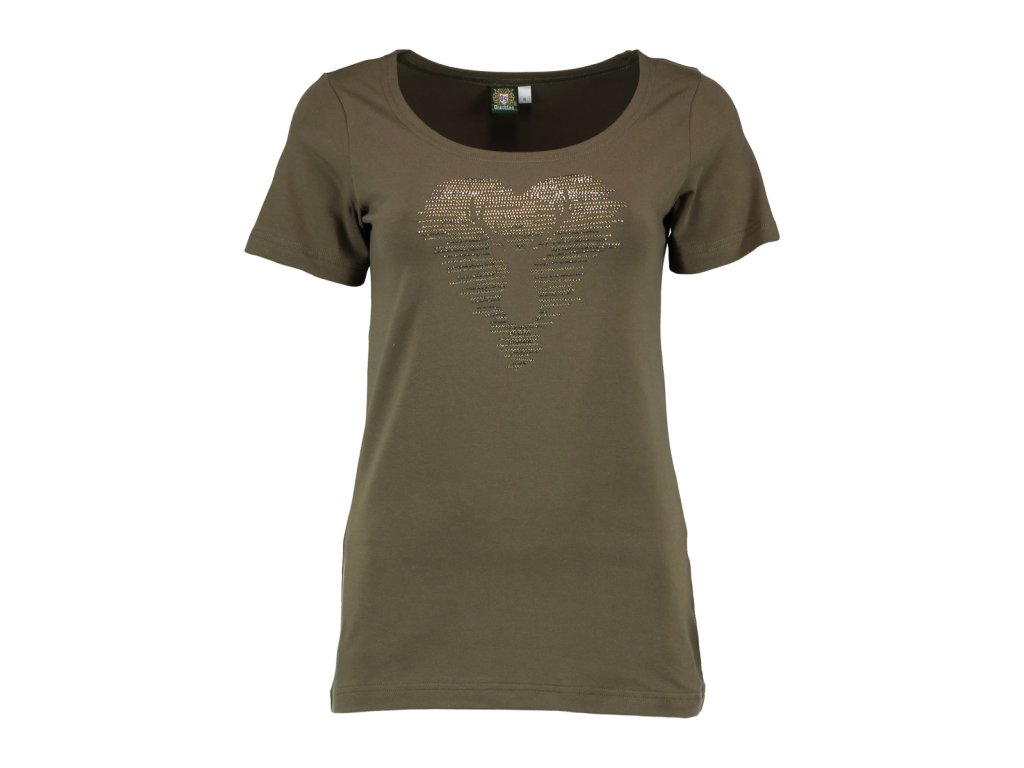 Krásné dámské myslivecké tričko Orbis s krátkým rukávem z příjemného pružného materiálu s mysliveckým motivem. Tričko je zdobené kamínky ve tvaru srdce, ve kterém je silueta hlavy jelena. Skvělý materiál z 90-ti % bavlny a 10-ti % elastanu. Barva trička zelená.
