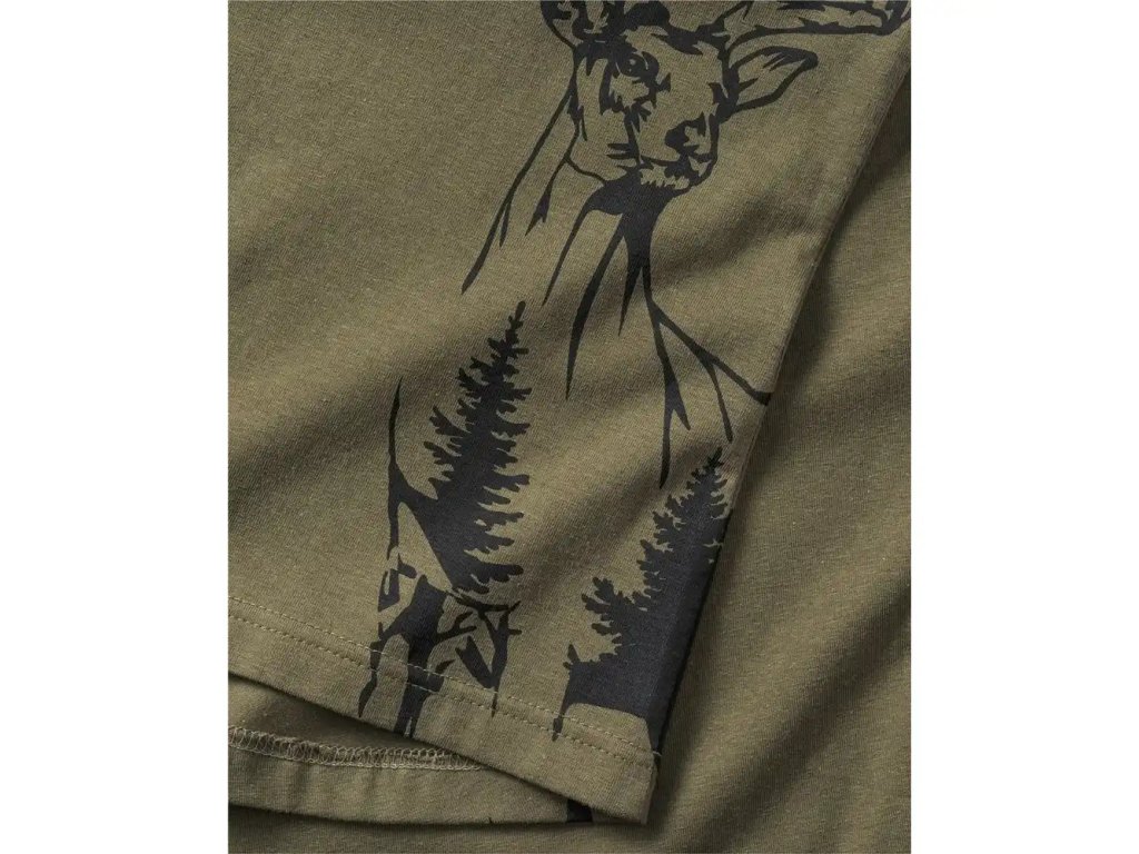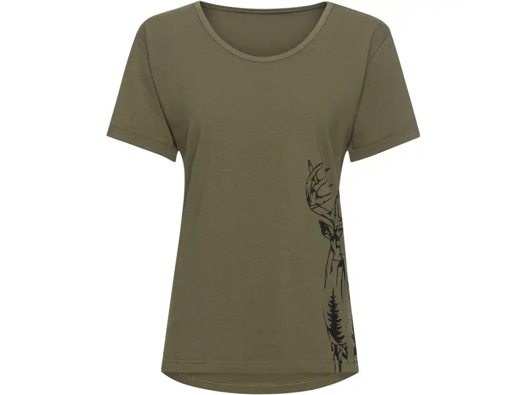 Bavlněné tričko s příměsí elastanu pro maximální pohodlní a volnost. Tričko má krásný potisk jelena na levém boku. Rukávy mají decentní a slušivý lem. Tričko má pěkný ženský v pase projmutější střih.