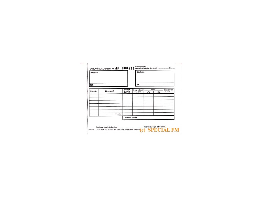 Daňový doklad ve formátu A6 nabízí naše firma SPECIÁL FM Pavla Vrublová. Blok je číslovaný, propisovací, s dvěma barevně odlišenými kopiemi pro každý číslovaný doklad. Černé písmo originál, 1. kopie červené písmo, 2. kopie modré písmo.