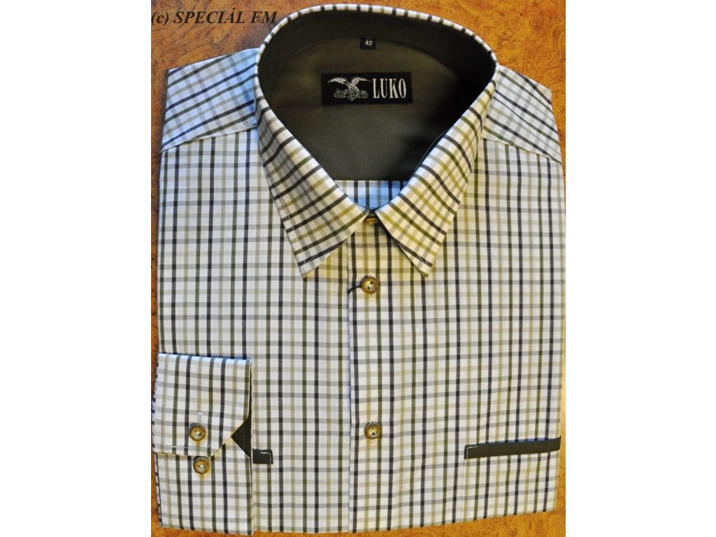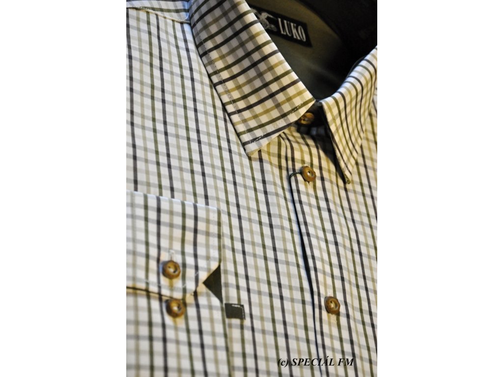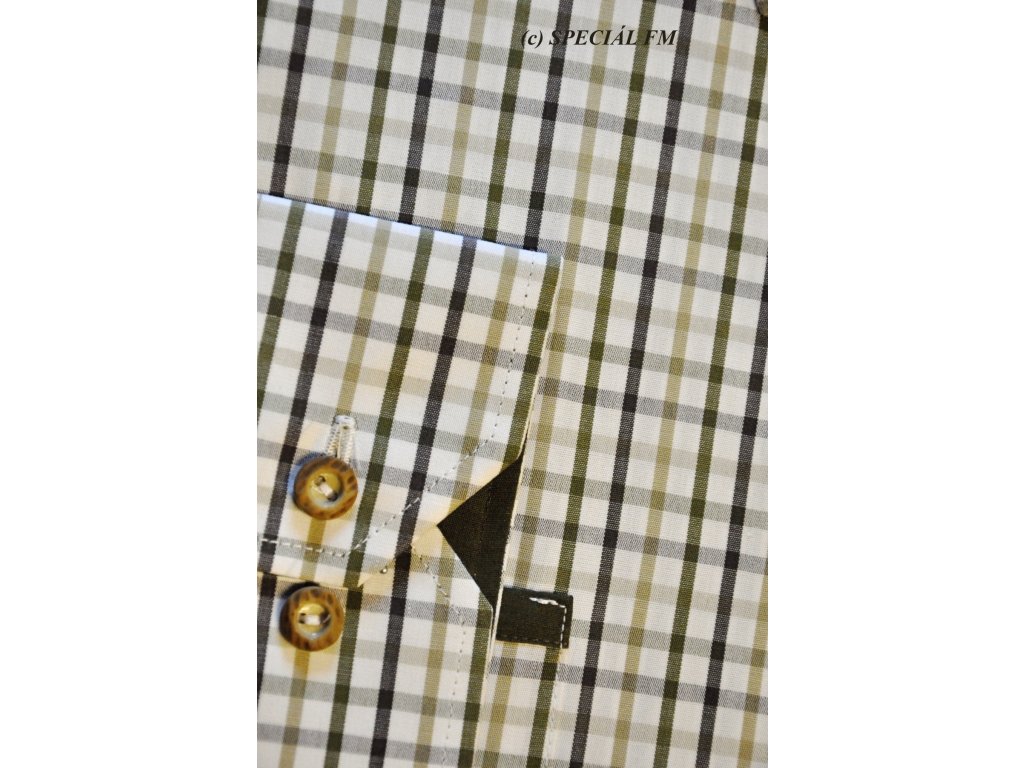Pečlivě ušitá košile s krásným kostkovaným vzorem jemných zelených a hnědých barev, s dvěma kapsami a s knoflíčky z paroží. Ruční práce.