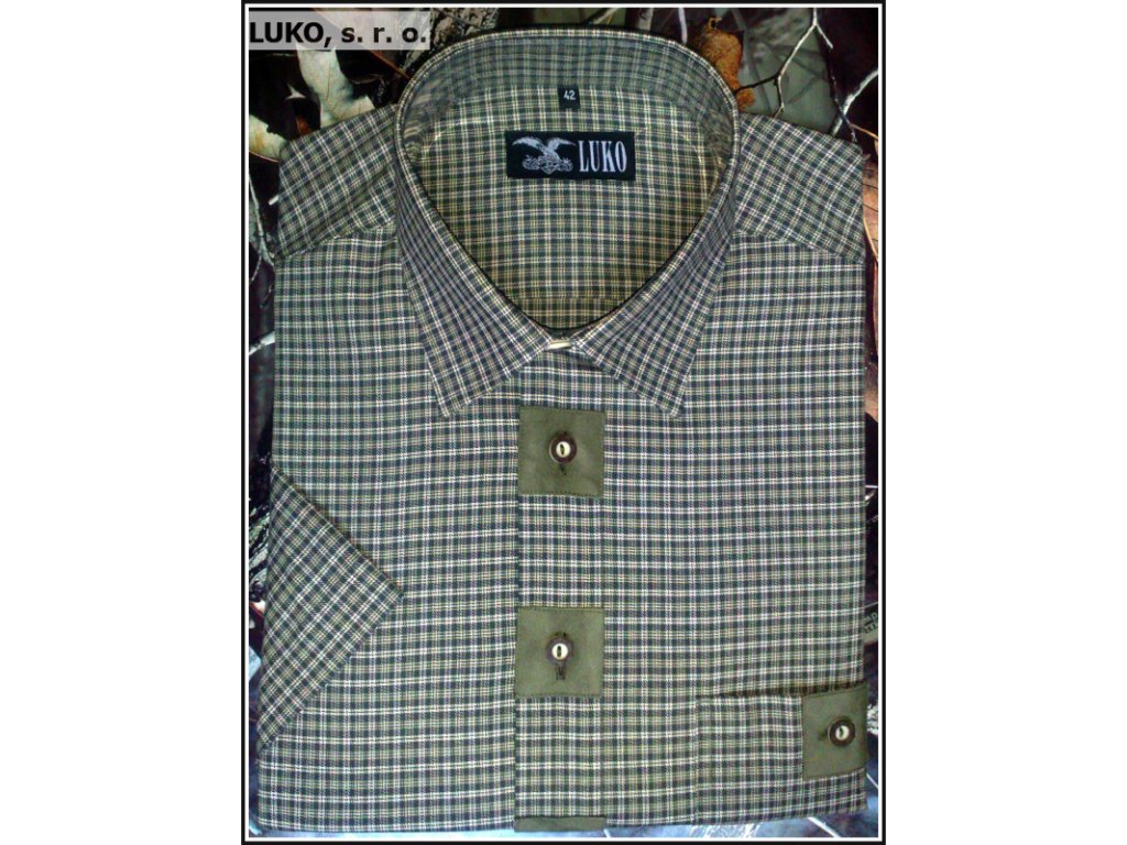 Pánská myslivecká košile českého výrobce ze 100% dlouhovlákné, vysoce kvalitní bavlny s úpravou easy care (snížená mačkavost, snadná údržba). Košile má na předním díle ozdobné čtverečky pod knoflíky z imitace kůže, s knoflíčky - imitace paroží, s jednou náprsní kapsičkou, pečlivá ruční výroba.