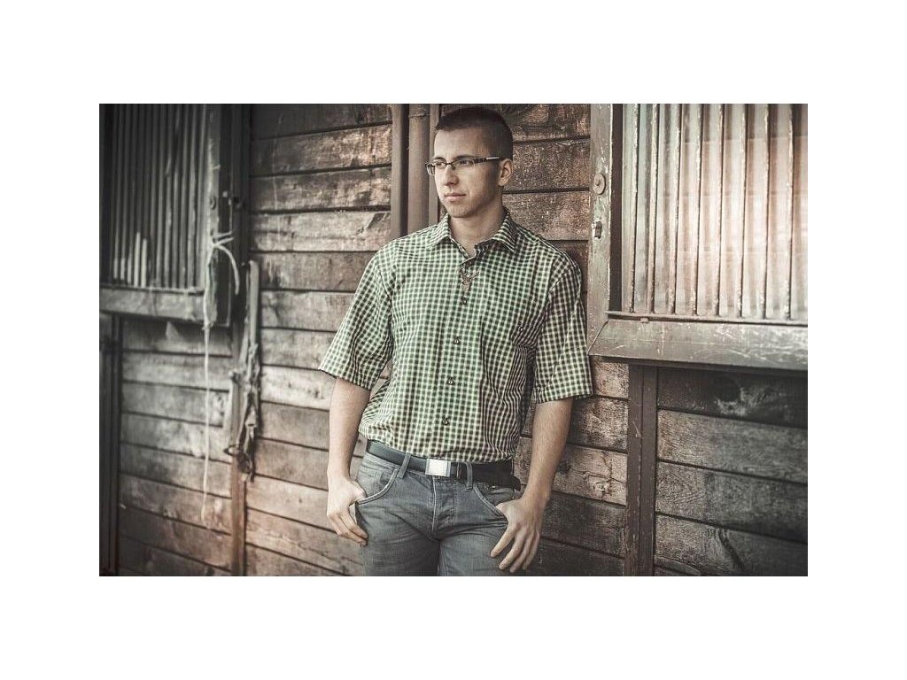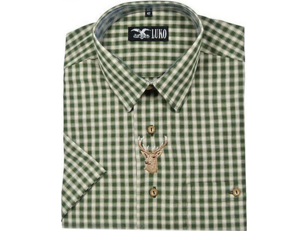Pánská myslivecká košile s krátkým rukávem ze 100% bavlny s úpravou pro sníženou mačkavost a snadné žehlení (easy care). Jemné káro dodává košili zajímavý sportovní vzhled a hodí se téměř pro každou příležitost. Košile má rovný střih a jednu kapsu, tužený polootevřený sportovní límec a výšivku na knoflíkové léze s motivem hlavy jelena v hnědé barvě. Myslivecké knoflíky jsou vyrobeny z imitace paroží, téměř k nerozeznání od pravých.