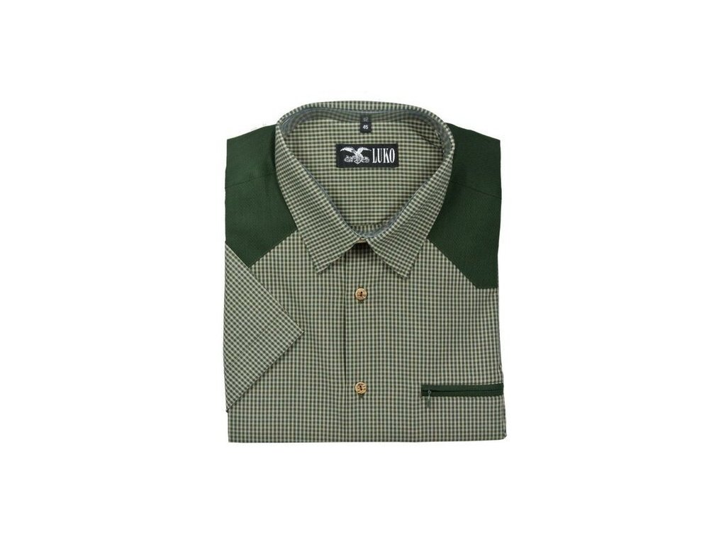 Nový vzor košile s krátkým rukávem je vyrobený z příjemné 100% bavlny. Jemné káro je na ramenou oživeno zelenou aplikací, kterou má i kapsička na zip. Košile se velmi příjemně nosí, má rovný střih a knoflíky v mysliveckém provedení. Košile má sportovní vzhled, lze ji použít ke kalhotům nebo vestičce i k neformálním společenským akcím.