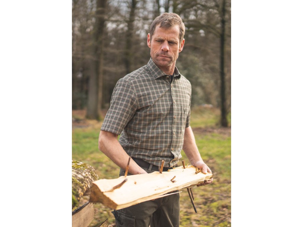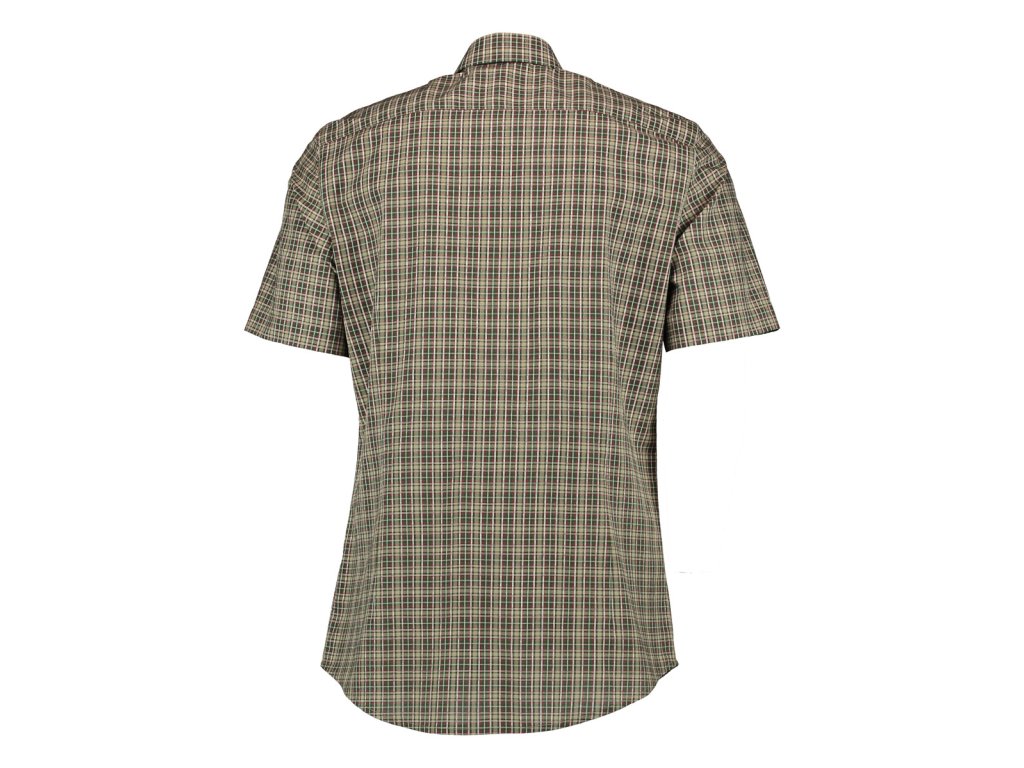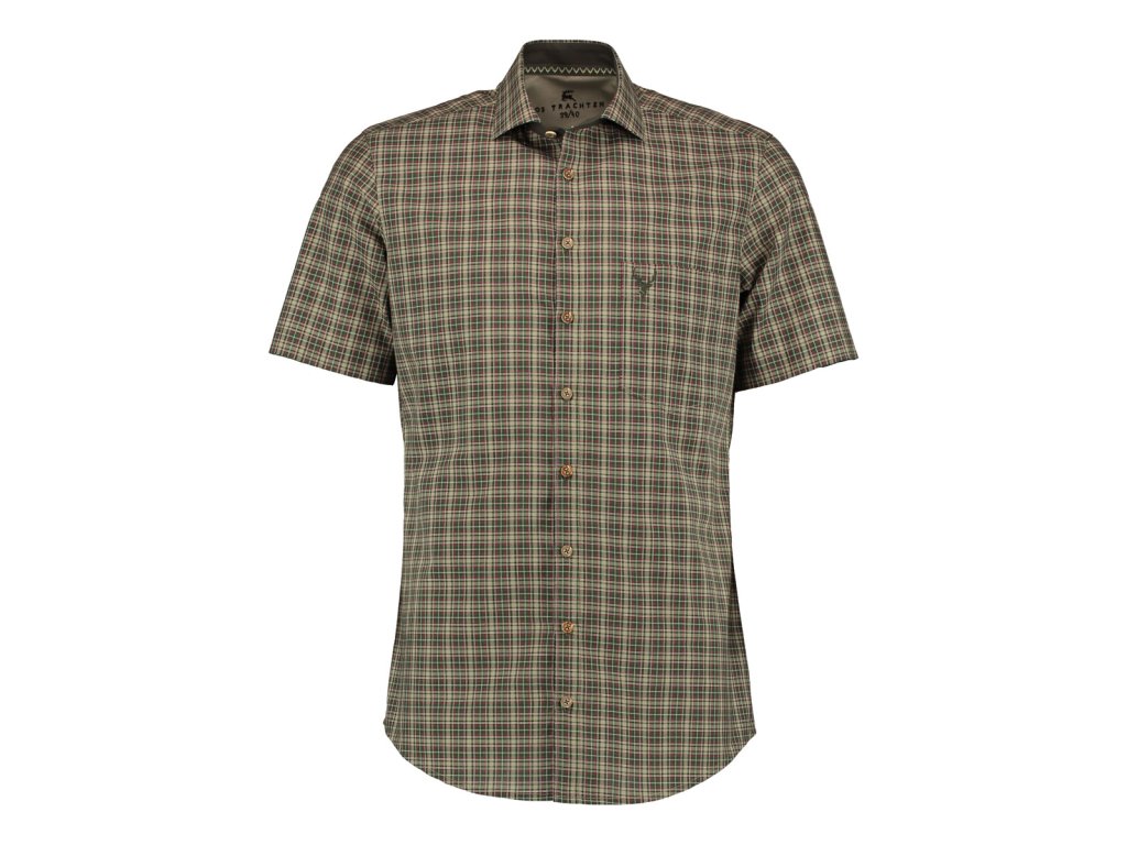 Krásná bavlněná košile červeno-zelená károvaná se stylovou výšivkou a kapsou na hrudi. Košile má krátký rukáv a knoflíčky z imitace paroží.