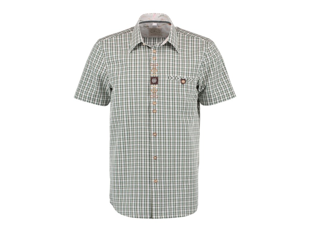Letní světle zeleně károvaná myslivecká košile ze 100% bavlny. Luxusně zdobená jemným vyšívaným vzorem, s knoflíčky z paroží a 1 kapsou na prsou.