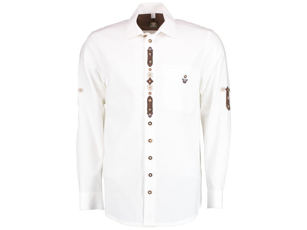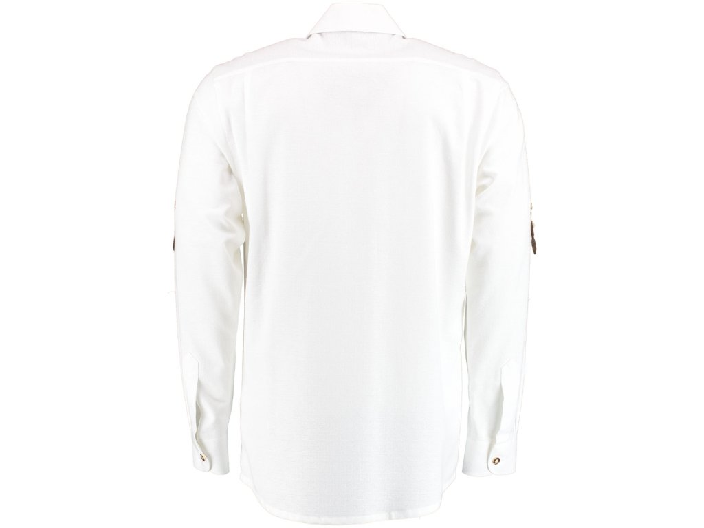 Krásná bílá společenská košile se stylovým zdobením. Košile je z velmi příjemného bavlněného materiálu. Dlouhé rukávy lze stočit na krátký a připnout pomocí jemného zapínání. Knoflíčky z imitace paroží.