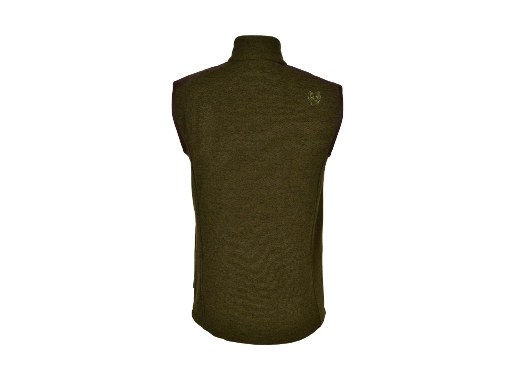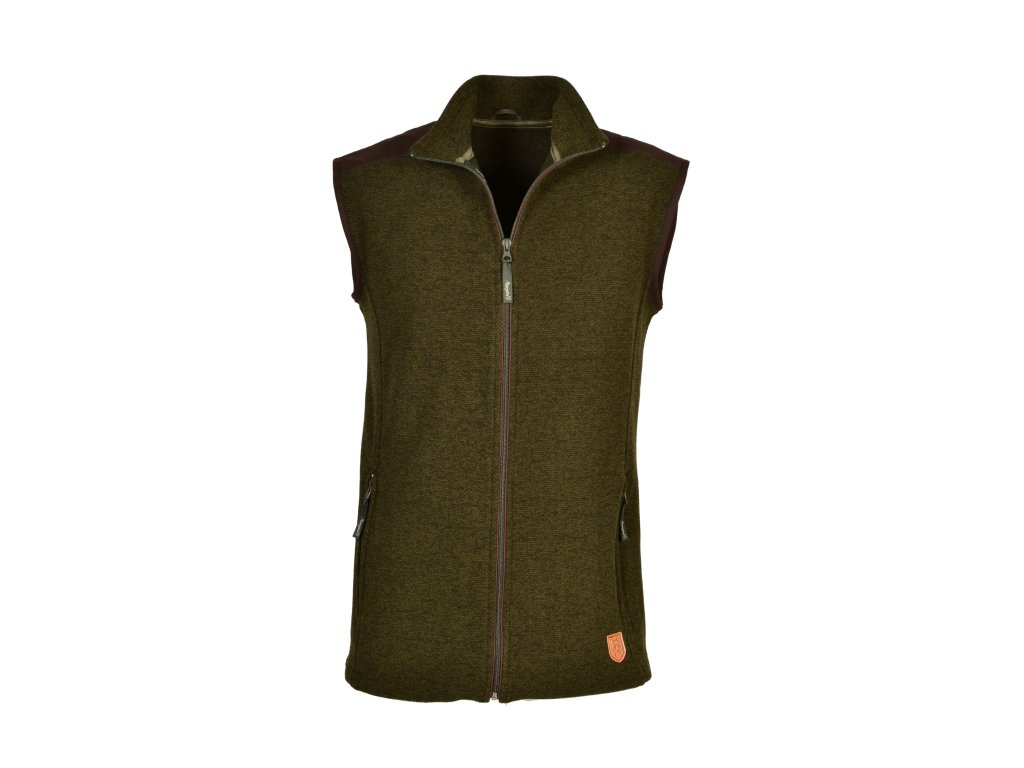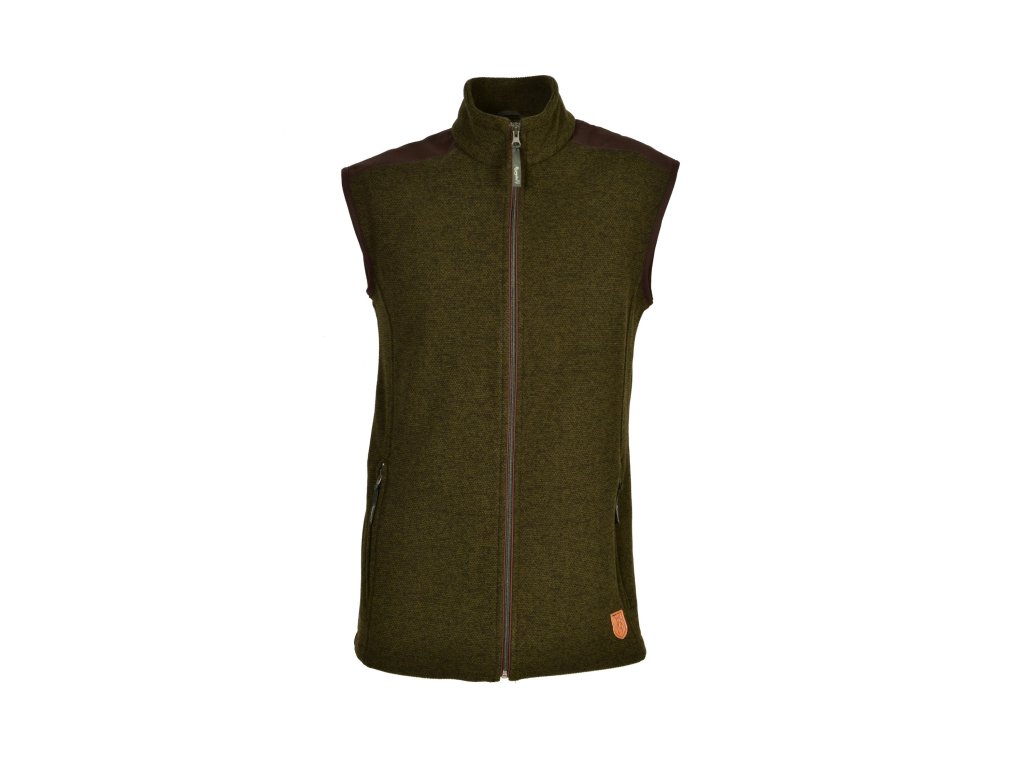 Pánská dobře padnoucí fleecová vesta moderního střihu s protižmolkovou úpravou. Má dvě boční kapsy na zips. Na ramenou je kombinovaná s materiálem hnědé barvy. Vesta je vyrobena z nejkvalitnějších materiálů a doplňků. Použité jsou nejkvalitnější zipsy YKK. Materiál je lehce pružný, velmi příjemný na dotyk. Je speciálně vyrobená jako imitace pleteného vzoru.