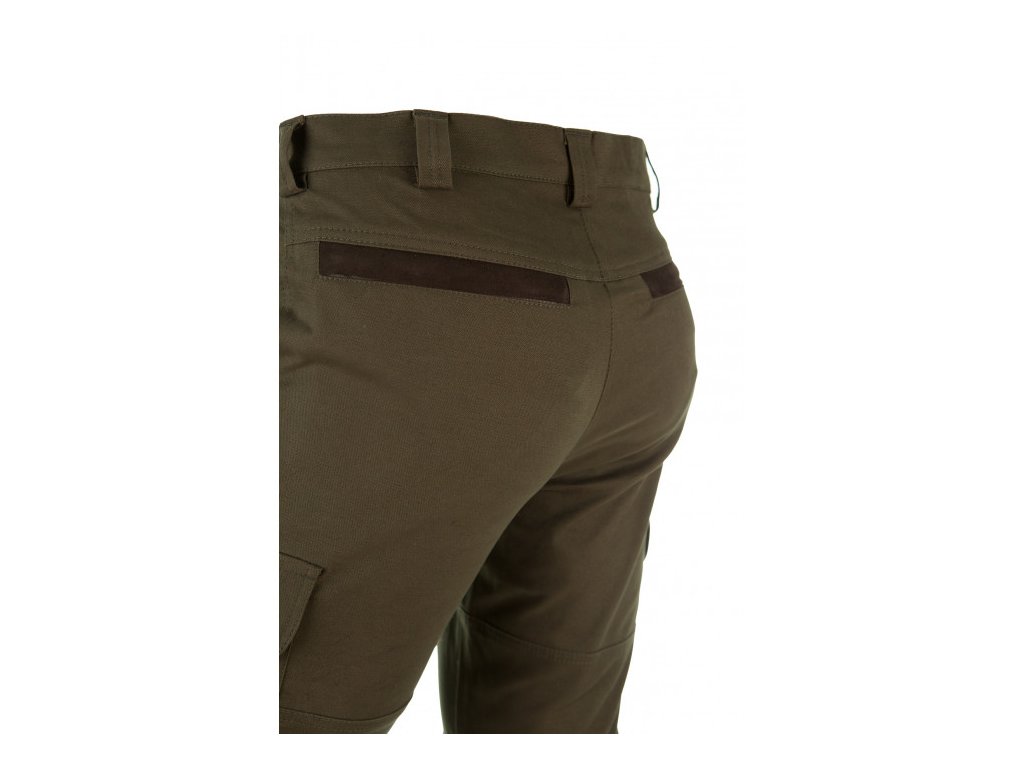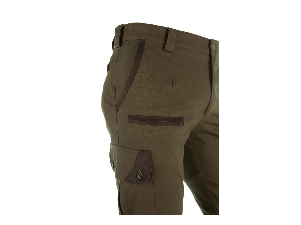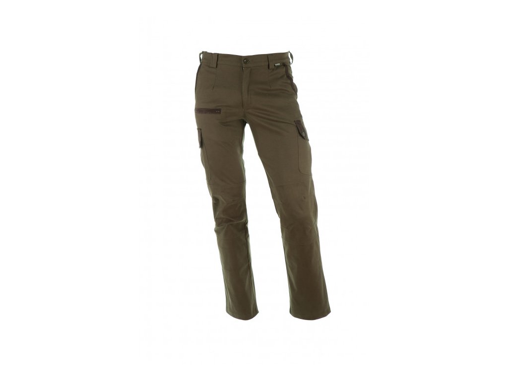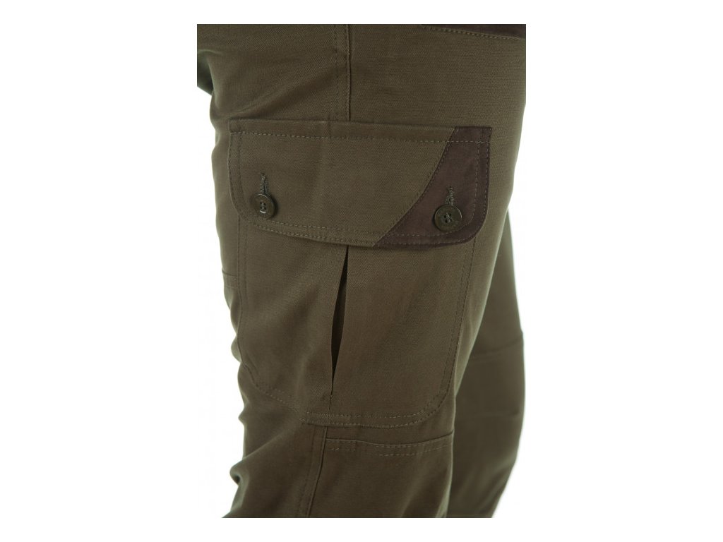 Praktické a pohodlné kalhoty z pevného bavlněného materiálu hezké tmavě zelené barvy s hnědými doplňky, na fotografiích je barva kalhot světlejší a méně zelená, než je ve skutečnosti. Mají velké množství kapes, jsou tvarované na kolenou, střihově řešené pro aktivní činnost v lese. Pro celoroční použití.