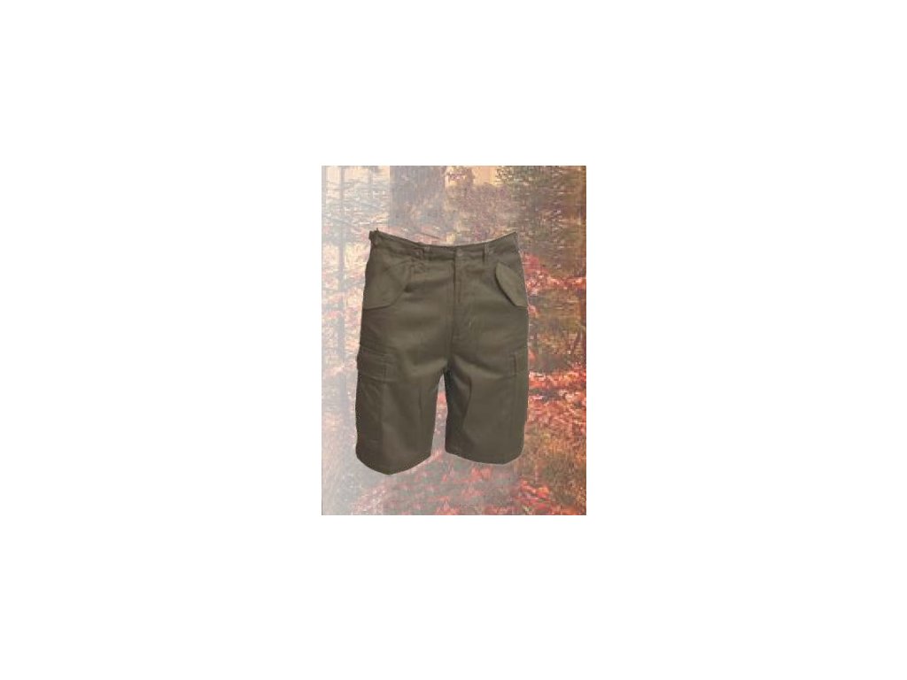 Tmavě zelené letní kraťasy příjemného materiálu 65% polyester a 35% bavlna se šesti kapsami, s možností připnutí šlí na knoflíčky, možnost úpravy velikosti v pase.