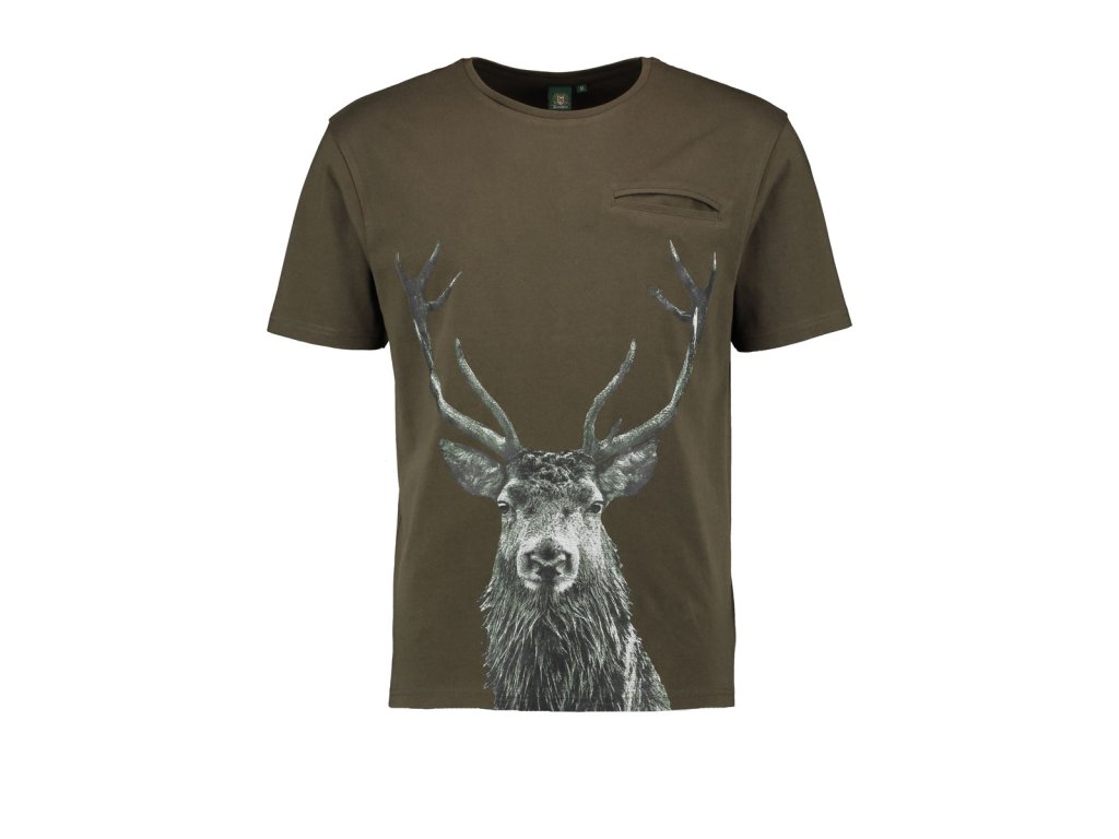 Bavlněné myslivecké tričko zelené barvy s krásným potiskem a praktickou kapsou na prsou.