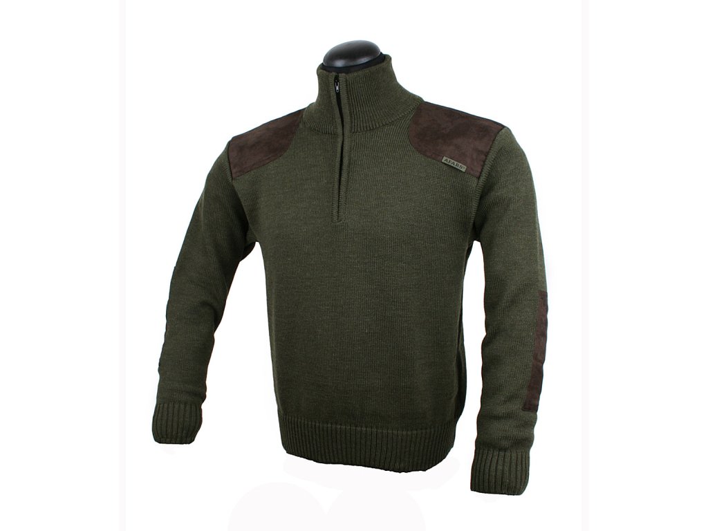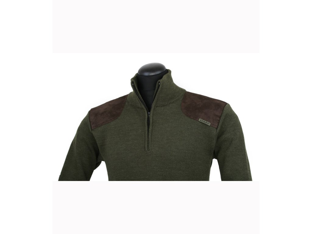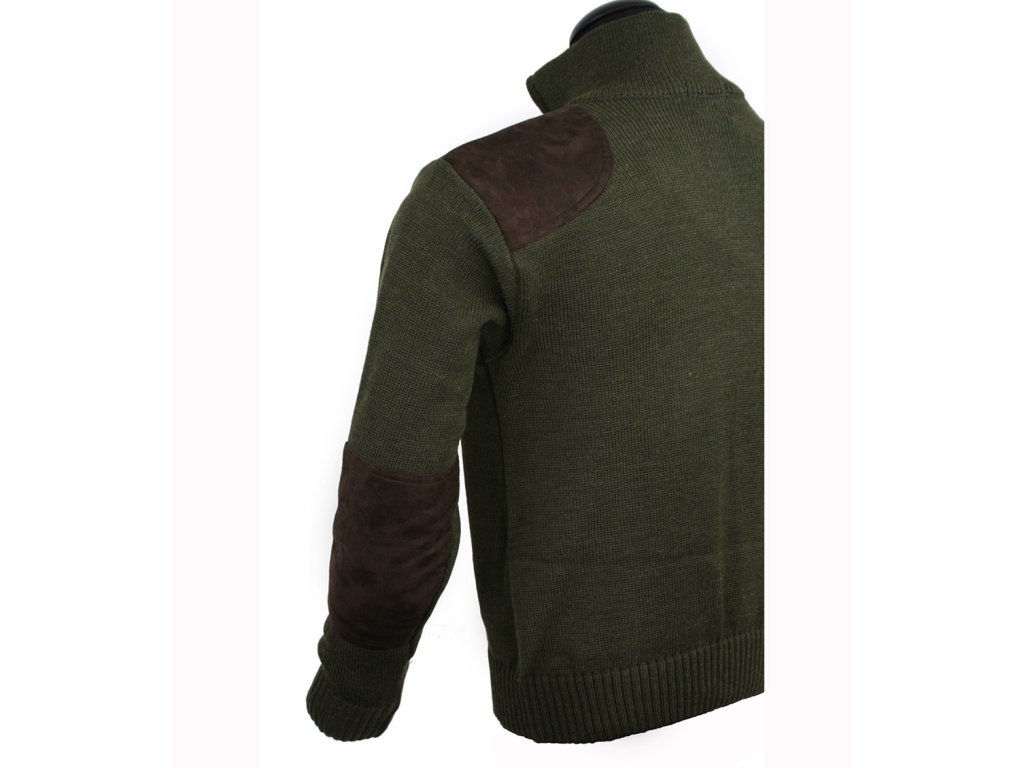 Velmi elegantní kvalitně šitý teplý svetr se zvýšeným límcem. Na ramenou a loktech má našitou aplikaci z imitace kůže hnědé barvy. Vyberoben v České republice, zakoupením tohoto výrobku podpoříte českého výrobce. Svetr je valchován, předem vysrážen.