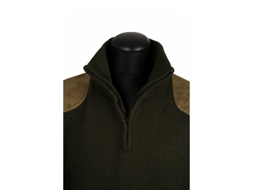 Velmi elegantní kvalitně šitý teplý svetr se zvýšeným límcem. Na ramenou a loktech má našitou aplikaci z imitace kůže zelené barvy. Vyberoben v České republice, zakoupením tohoto výrobku podpoříte českého výrobce. Svetr je valchován, předem vysrážen.