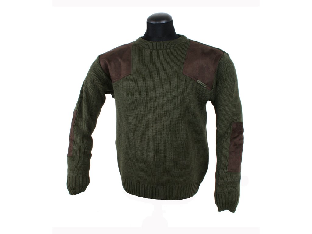 Lovecký svetr Hubert má na ramennou a loktech našitou aplikaci z imitace kůže zelené barvy.