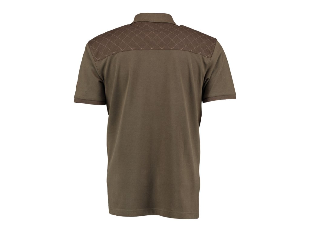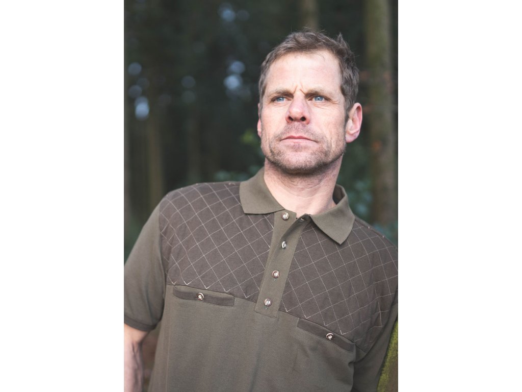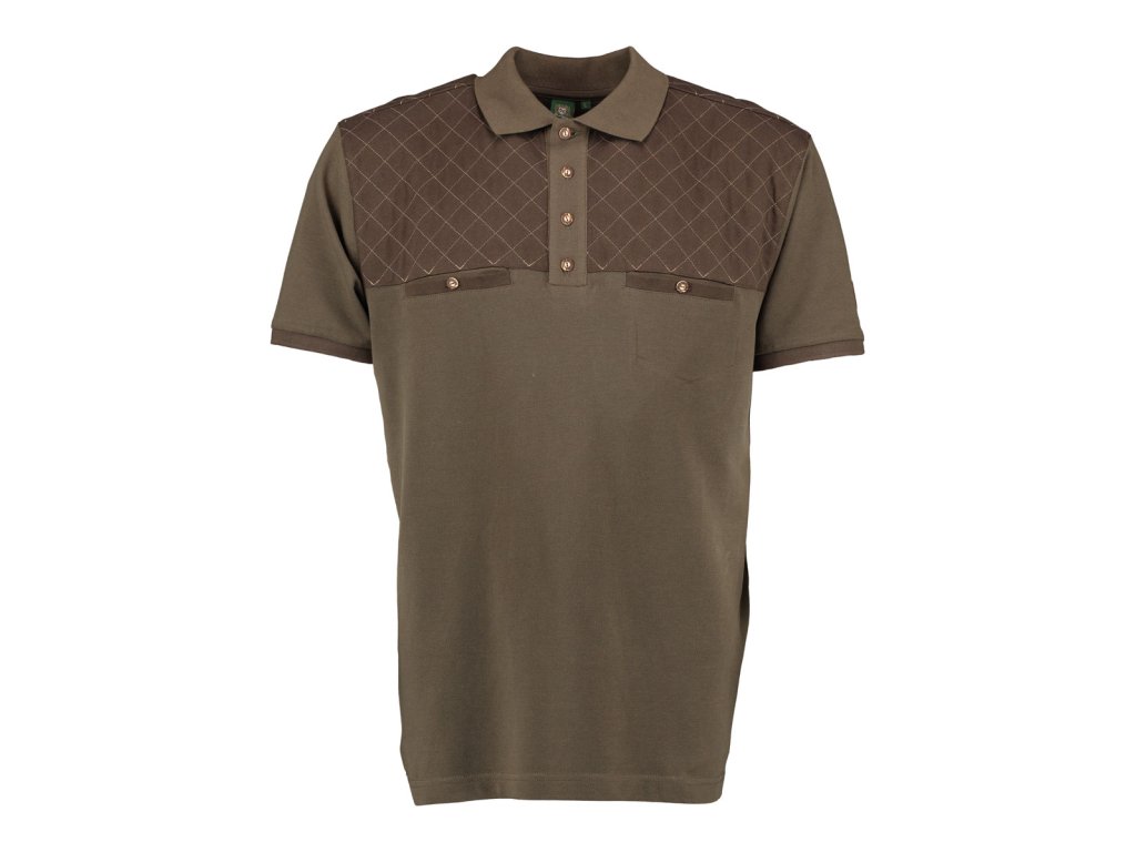Pánská stylová myslivecká polokošile zelená barvy s prošívanou aplikací z imitace hnědé kůže na ramenou a hrudi. Košile má dvě kapsy. Knoflíčky jsou z imitace paroží.