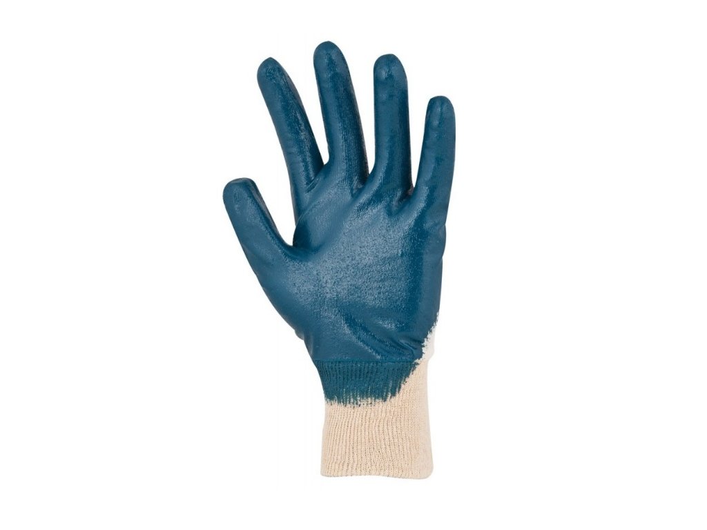 Oblíbený bavlněný úplet polomáčeny v nitrilu, pružný náplet na zápěstí, barva modrá, vhodné do prostředí s výskytem olejů.