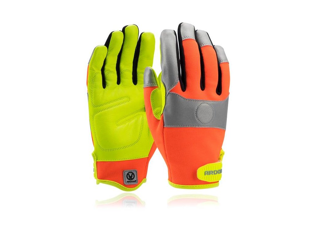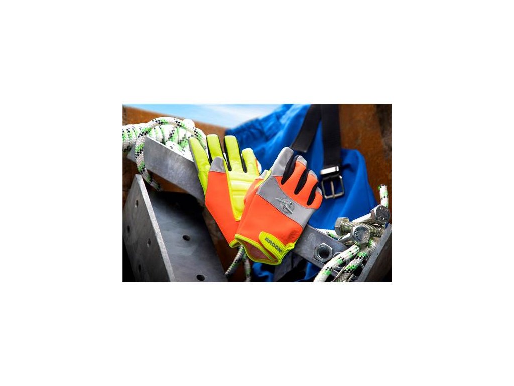 Reflexně žlutá dlaň z kvalitní kozinky, oranžový hřbet se spandexem. Spandex má vynikající elasticitu, oděvy z materiálu s tímto vláknem jsou pevné, pohodlné, odolné oděru a nemačkají se. Rukavice mají magnetek na hřbetu, který přidržuje kovové věci při práci jako například hřebíky. Reflexní doplňky. Manžeta na suchý zip. Barva žluto-oranžová.