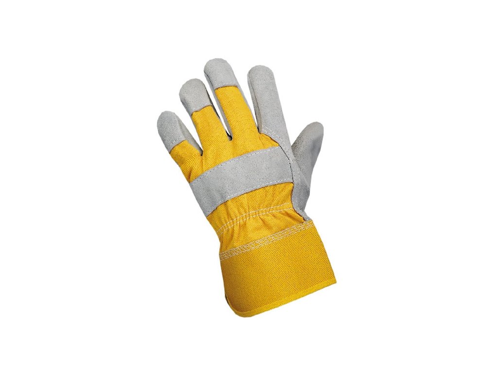 Dlaň z šedé hovězí štípenky, hřbet a výztužená manžeta ze žluté bavlněné tkaniny, podšívka ve dlani.